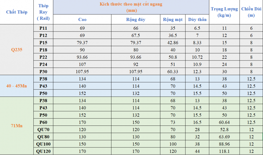Chiều dài tiêu chuẩn: 6m, 8m, 10m, 10.5m, 12m và 12.5m và chiều rộng đầu ray : 70mm, 80mm, 100mm,120mm.