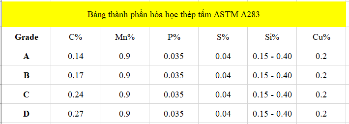 Thép tấm ASTM A283 là thép tấm Carbon – Được sản xuất theo tiêu chuẩn Mỹ ASTM – Chuyên làm về kết cấu thép – A283 là vật liệu thép tấm carbon có độ bền kéo trung bình phổ biến , có bốn lớp A B C và D.