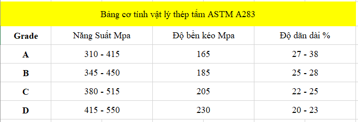 Thép tấm ASTM A283 là thép tấm Carbon – Được sản xuất theo tiêu chuẩn Mỹ ASTM – Chuyên làm về kết cấu thép – A283 là vật liệu thép tấm carbon có độ bền kéo trung bình phổ biến , có bốn lớp A B C và D.