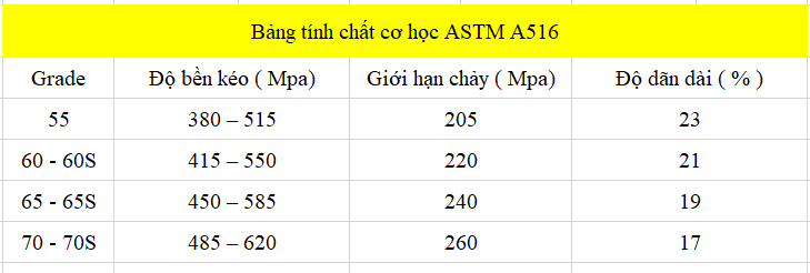 bốn lớp: Lớp 55, 60, 65 và 70 . Phổ biến nhất là Lớp 70 hoặc được gọi là A516-70. Độ dày tối đa của các tấm chỉ bị giới hạn bởi công suất của chế phẩm