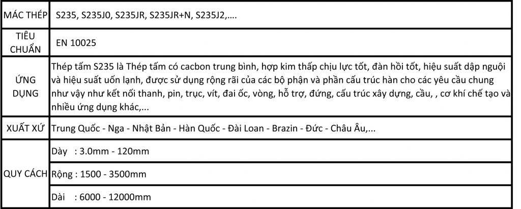 Thép tấm S235: được hội đồng tiêu chuẩn Thép Châu Âu giới thiệu lần đầu tiên vào năm 1990 và được giám định đạt tiêu chuẩn EN10025 bởi Viện Tiêu Chuẩn Anh Quốc BSI, BS EN 10025 & S235JR. Do sức cong trung bình tối thiểu là 235N/mm2 nên được gọi là S235 .